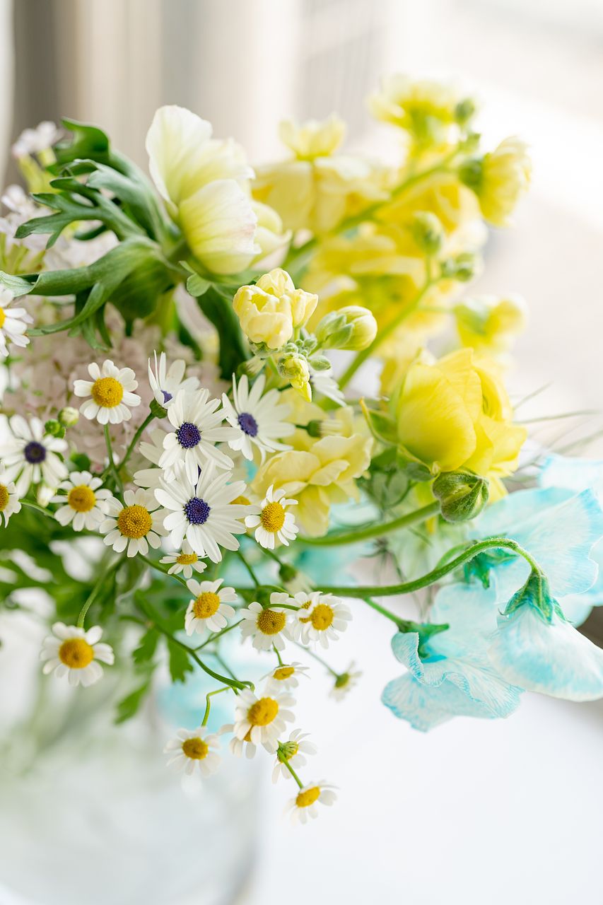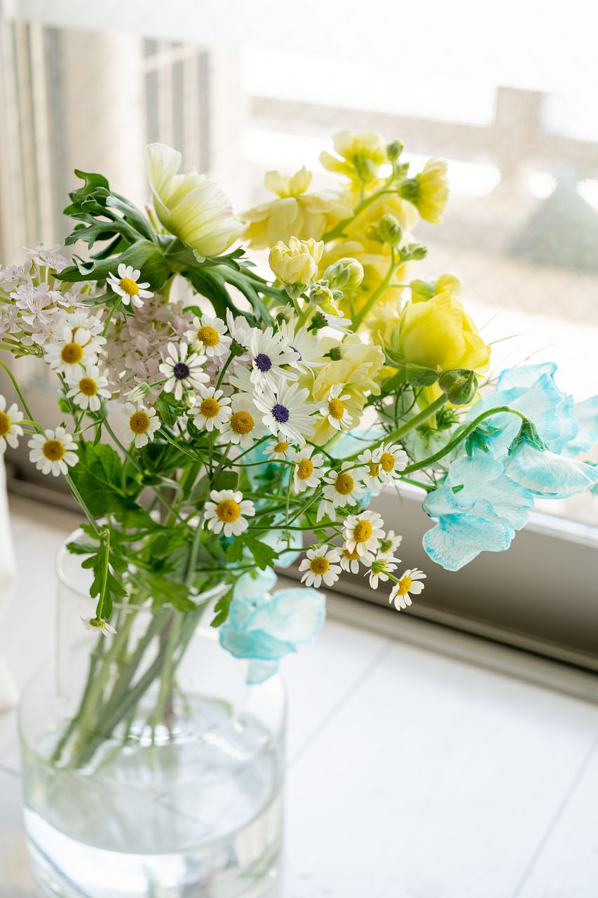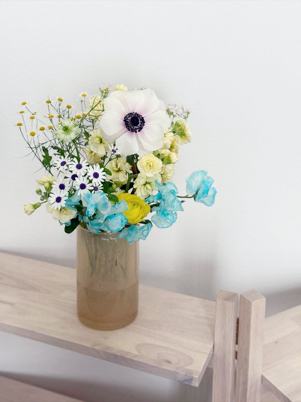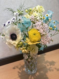 染めのスイートピーが蛍光ブルーだったのでイメージと違っていましたが、サイネリアやアネモネ、ラナンキュラスなどこの時期の可愛い花が複数入っていてよかったです✨