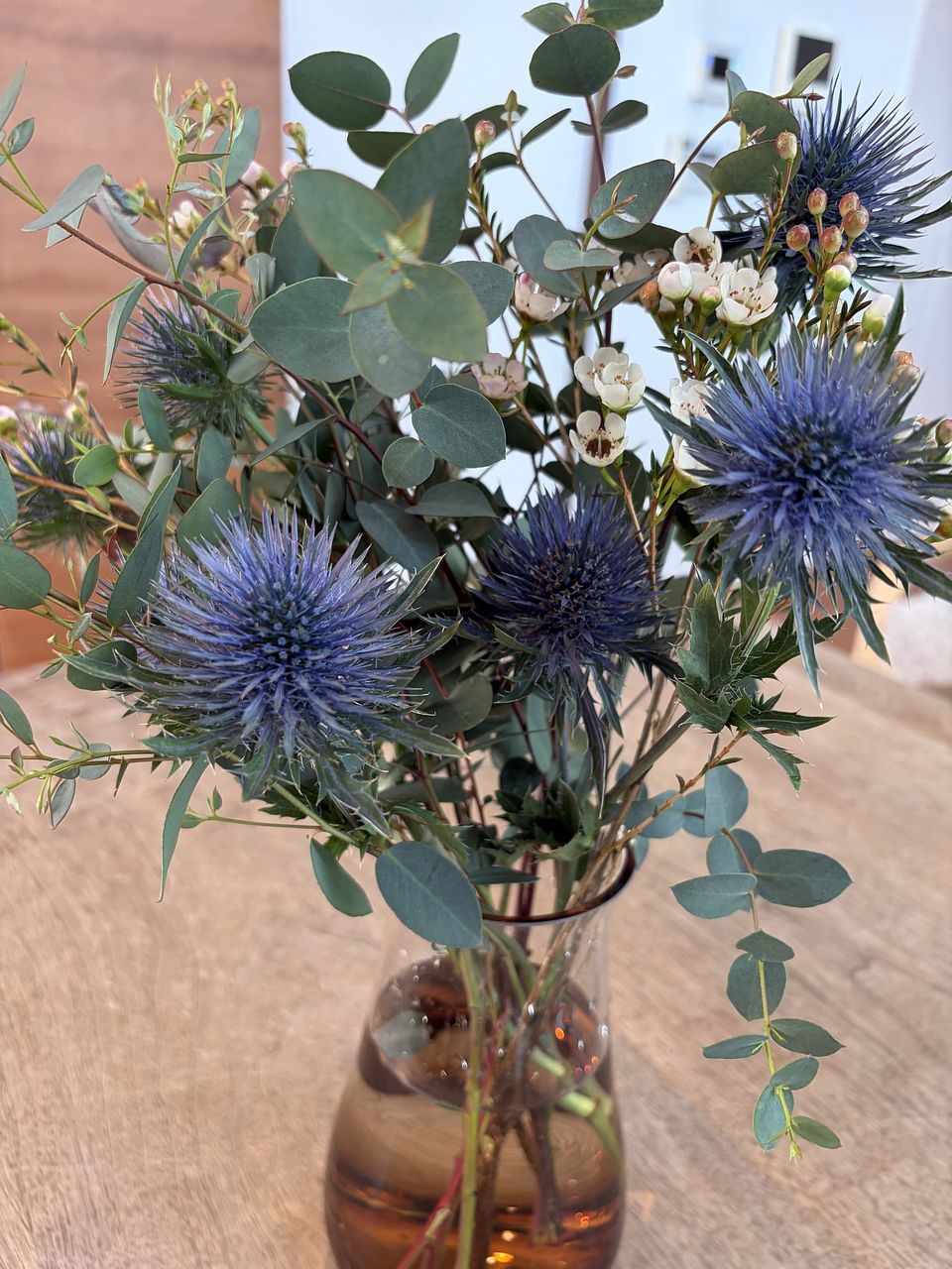 ワックスフラワーやエリンジウムを組み合わせて。ドライに向いてるお花をセレクトしています。ユーカリの香りも楽しんで! ワックスフラワーは葉っぱをこするととっても良い香り。