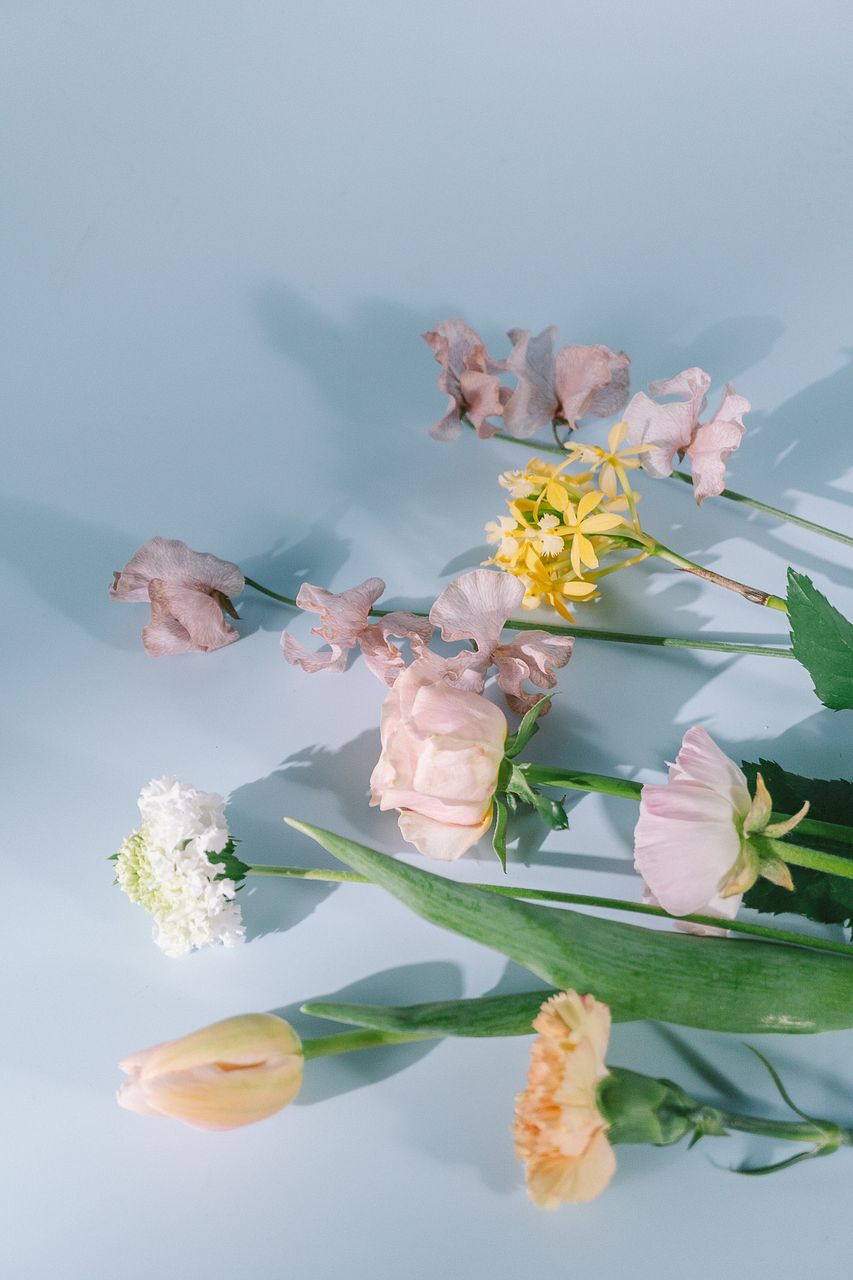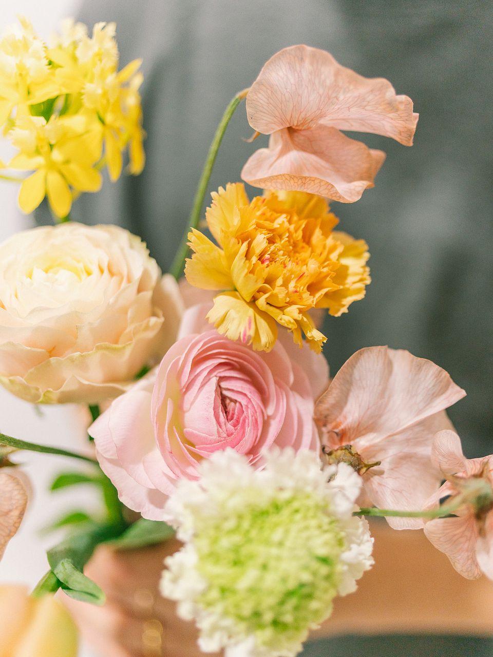 スイトピー、チューリップ、ラナンキュラス、春のお花を中心にイエロー〜ピンクの温かみのあるグラデーションのお花たちを集めてみました!