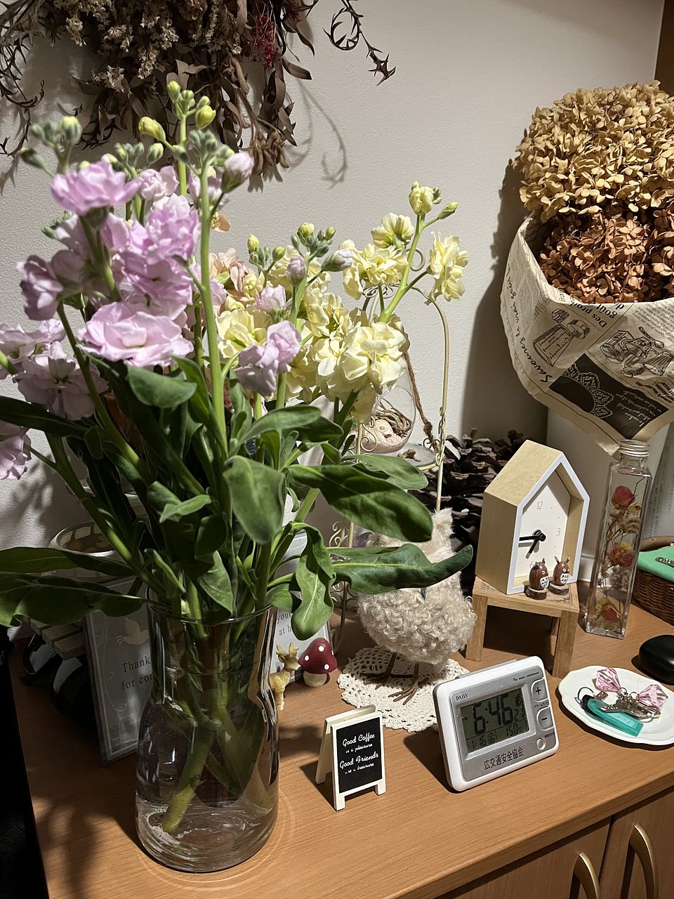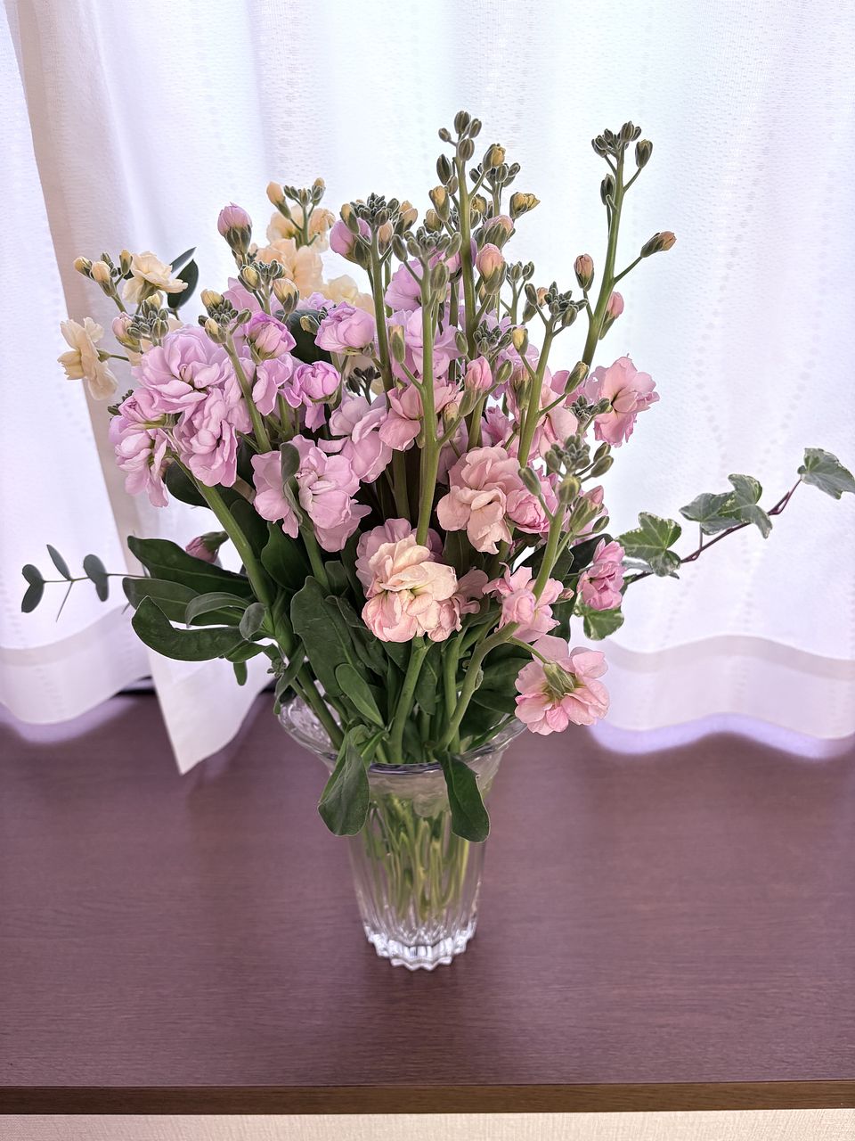とてもボリュームがあり可愛らしい色のストックの束でした