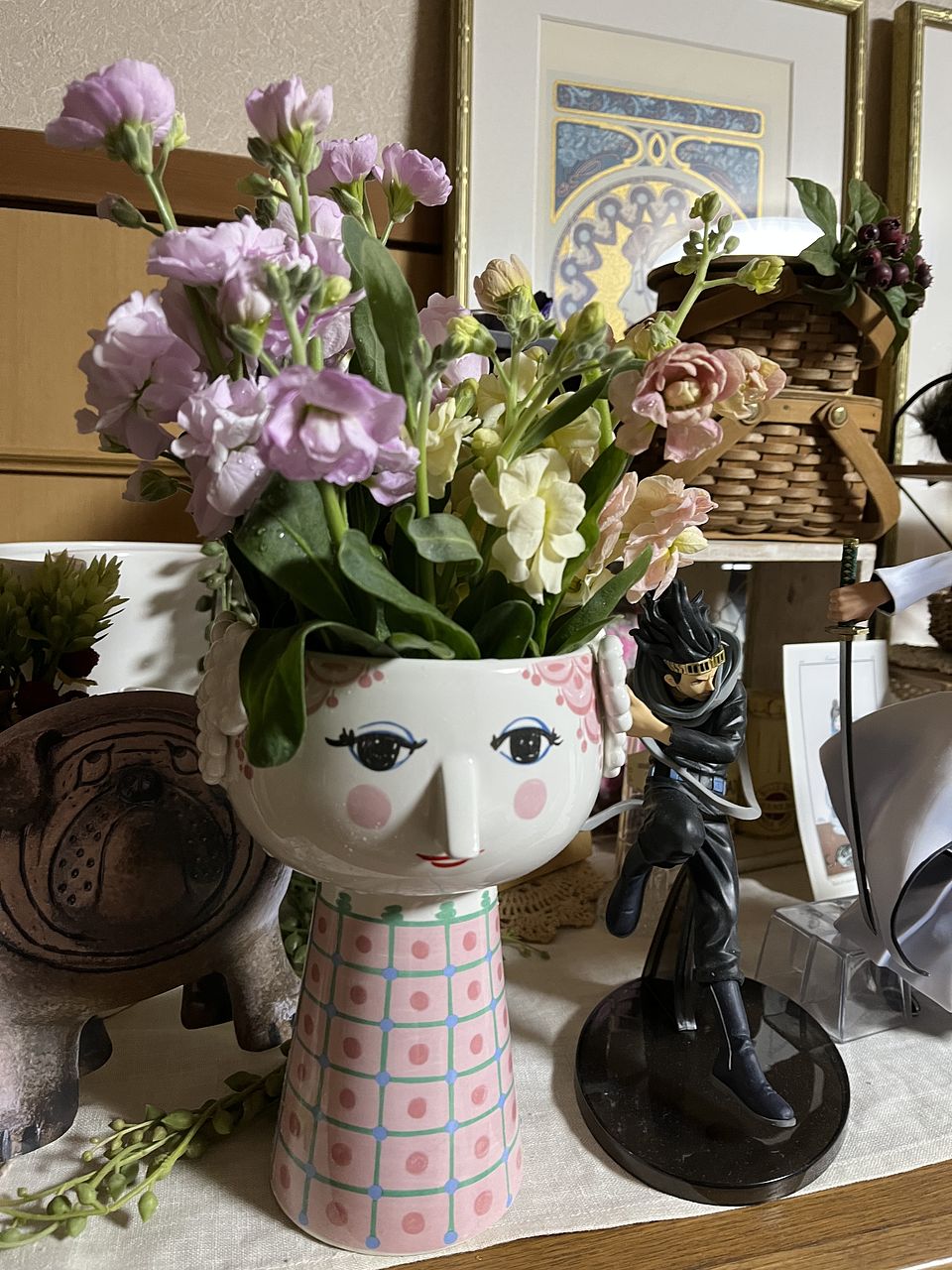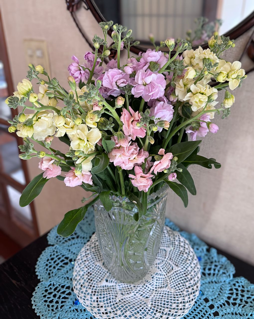優しいパステルカラーのストックで早めの春が来たような気分になりました。ボリュームもあり玄関が明るくなりました♡