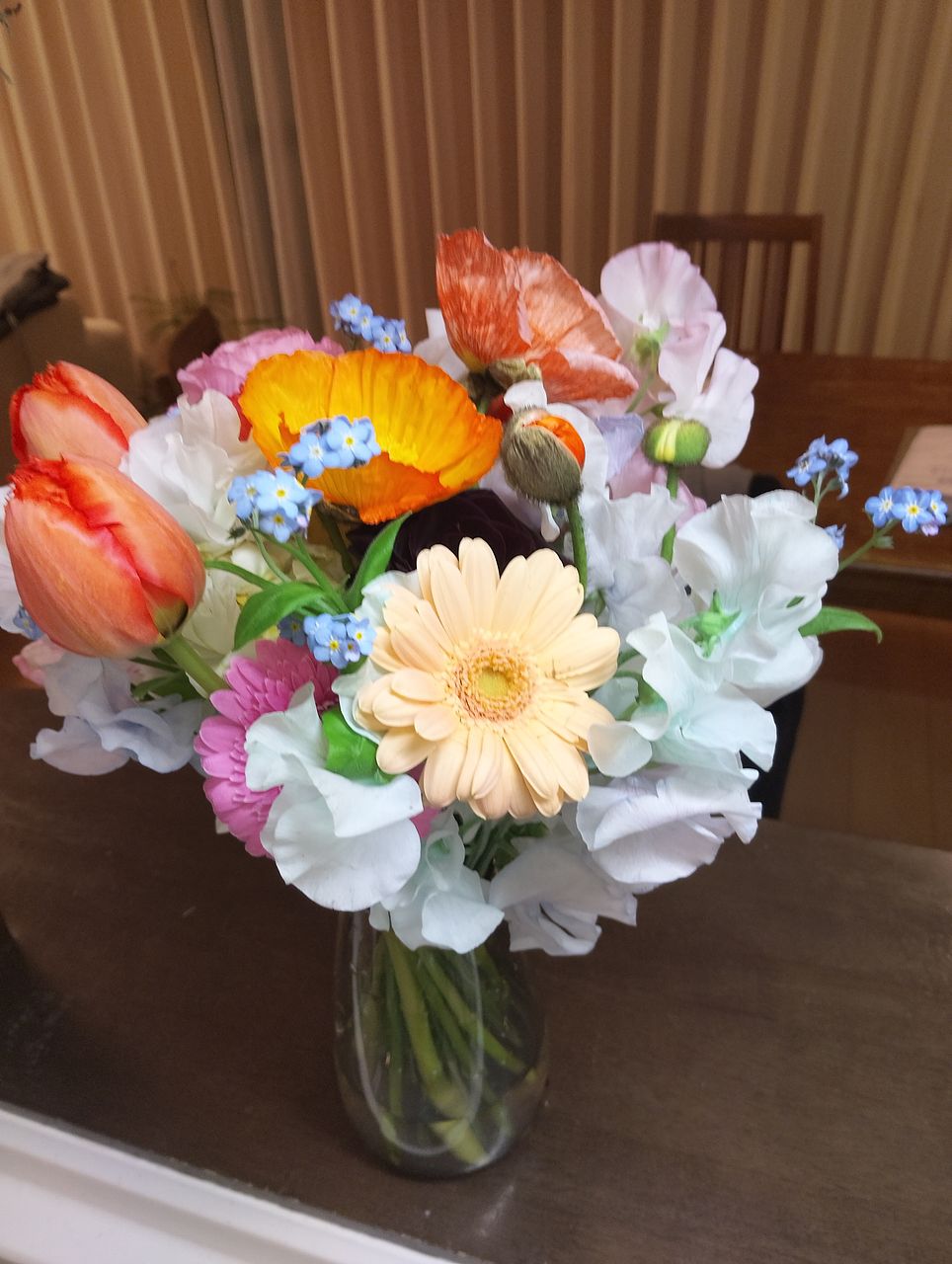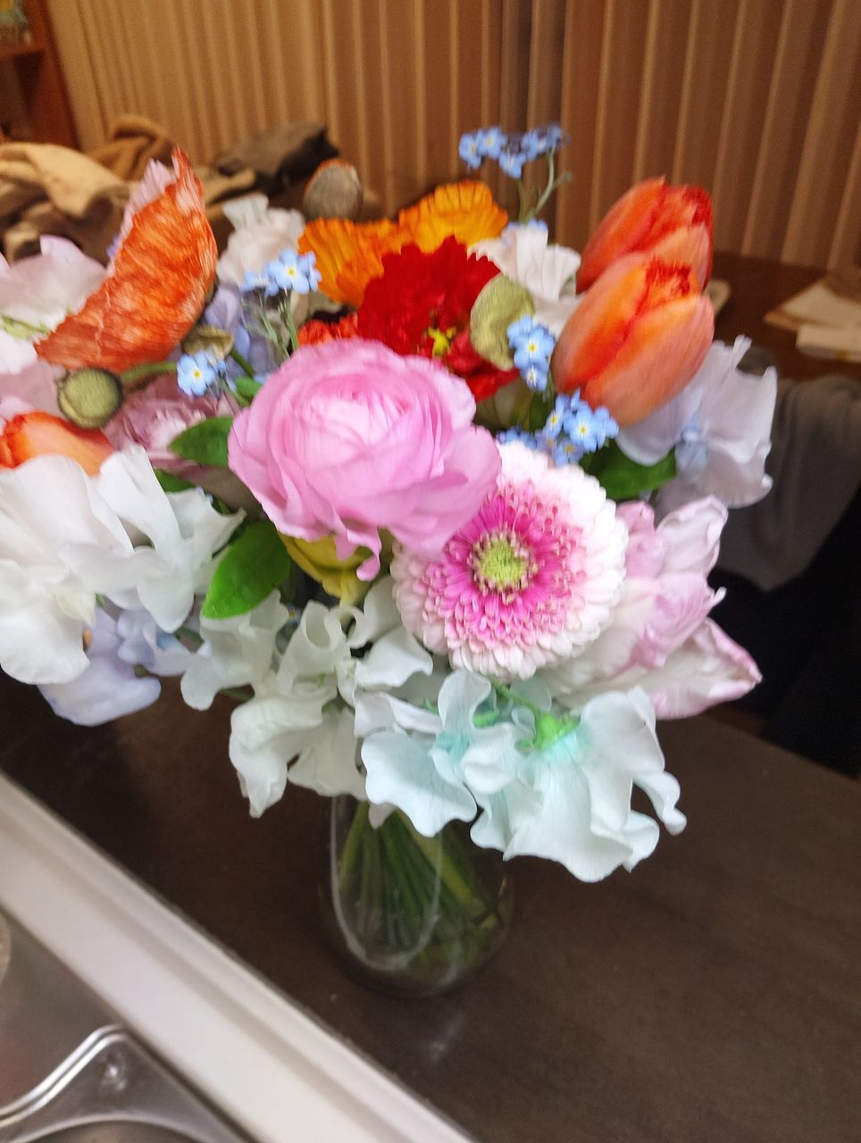 スパイラルに組まれていて葉の処理もしてあるのでそのまま飾って楽しめます。たっぷり入っているので華やかです。内容は毎回おまかせですが、色の雰囲気は同じ雰囲気でお届け予定です。お楽しみに!