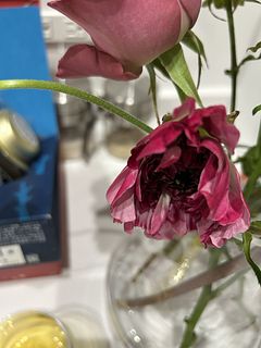 とっても素敵な組み合わせのブーケで嬉しかったです!お花を触らずに気をつけて箱から出したのですが、ミニバラが一輪折れてしまっていて可哀想でした…小さいグラスに入れて飾ってます。箱に入れる時に折れたのかな…?