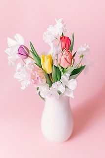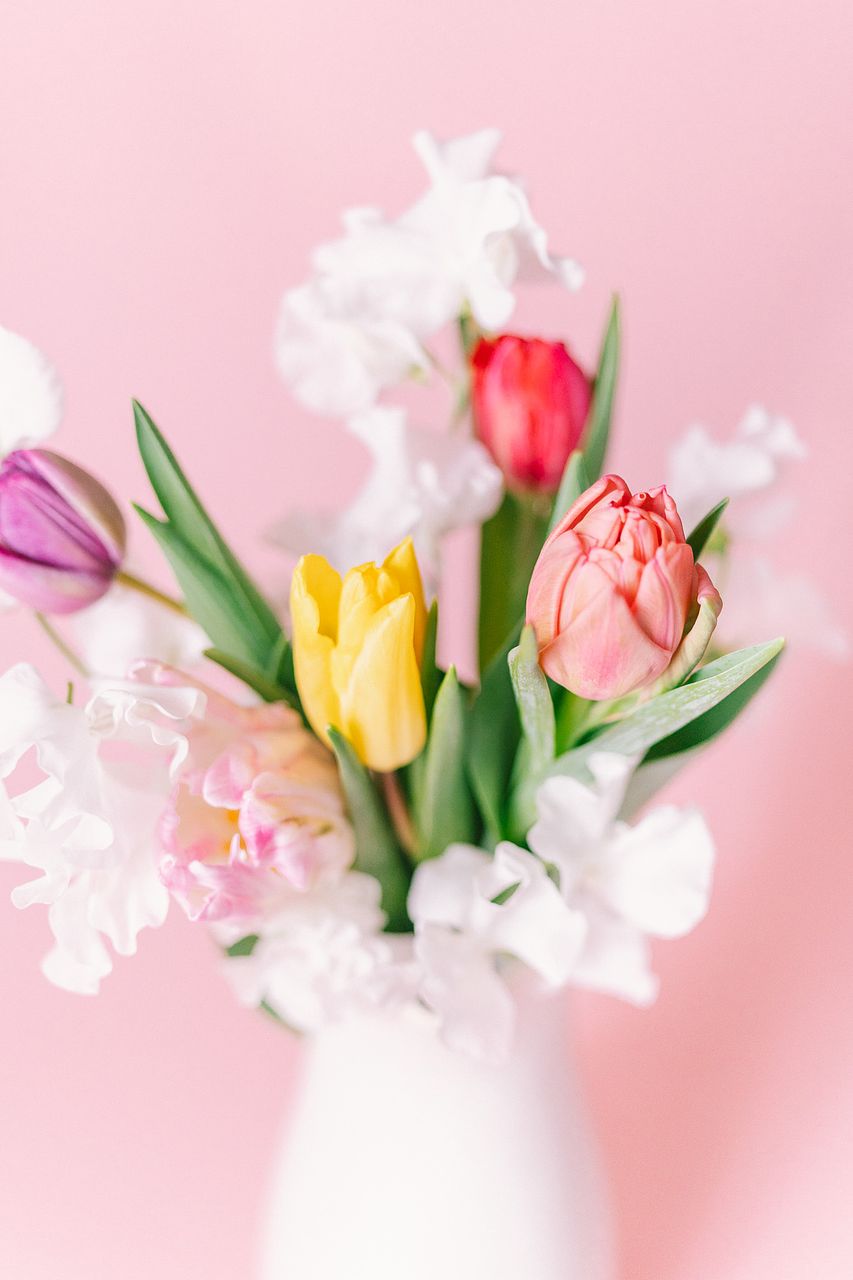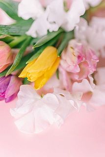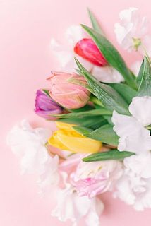 チューリップとホワイトスイートピーが主役の贅沢な春のおまかせブーケはいかが。かわいい組み合わせでお届けします。