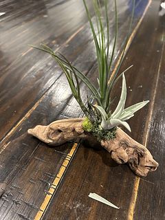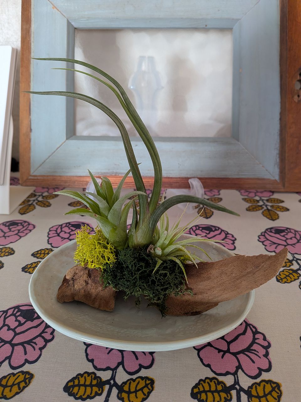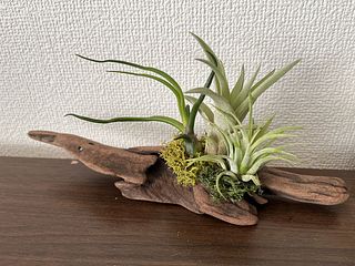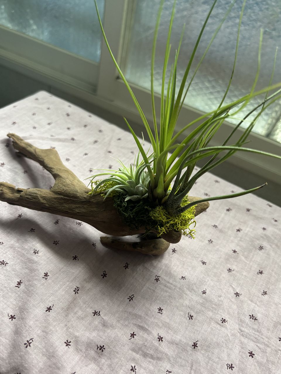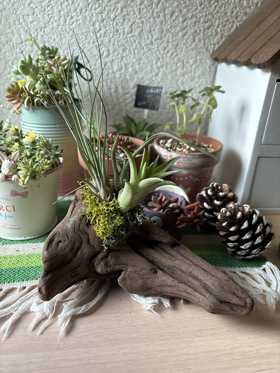 箱の中で一部折れてしまっていました。 流木のカタチは好みな感じで、エアプランツたちがすっと立っている様子がとってもかわいいです。 枯らさないように頑張ります。