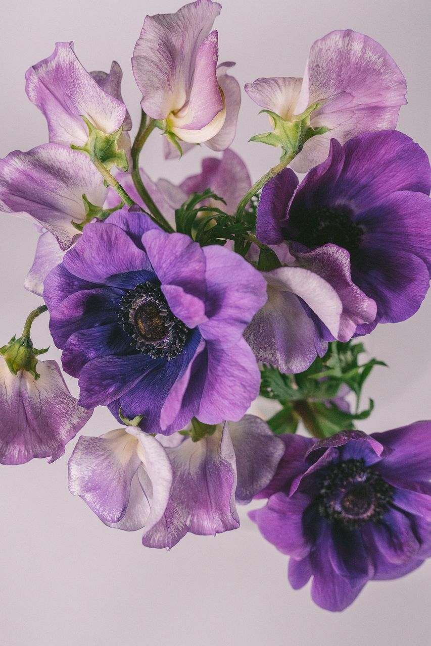 珍しいディープパープルのアネモネ「モナリザブルー」とパープルカラーが美しいスイートピー贅沢に束ねて🦋