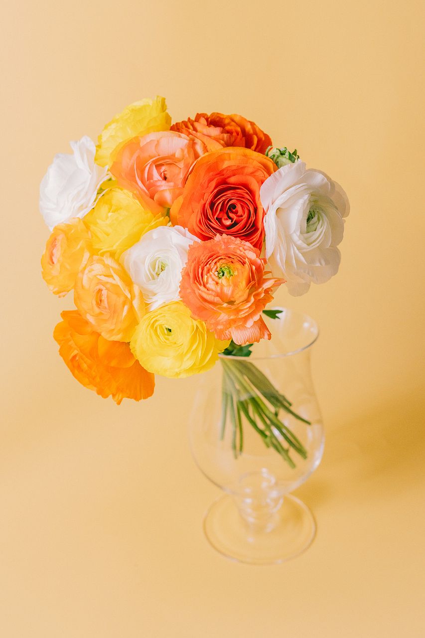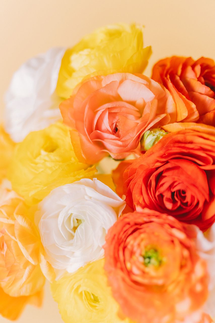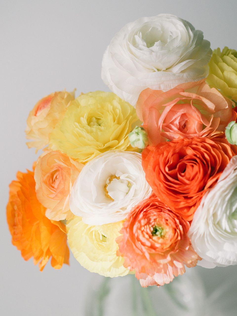 濃淡のバラエティ豊かなシトラスカラーのラナンキュラスをたっぷり束ねて。