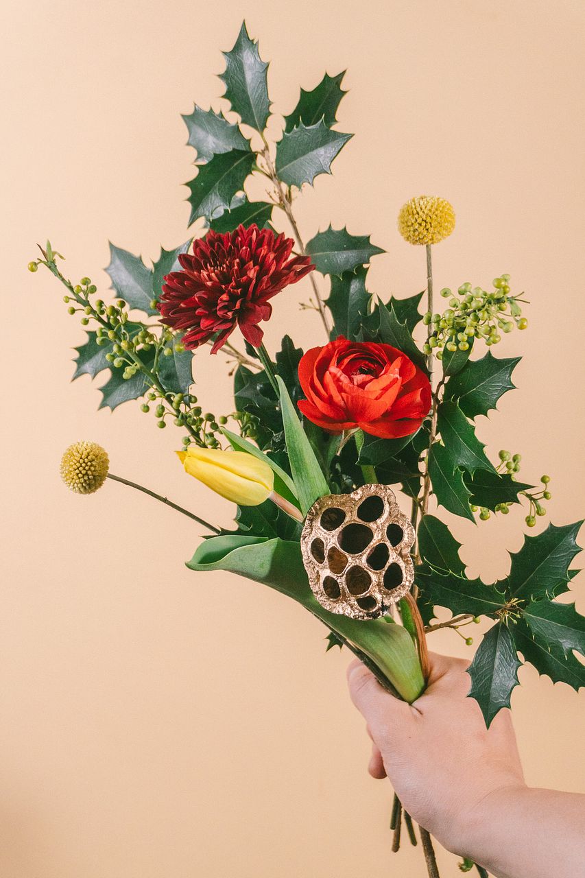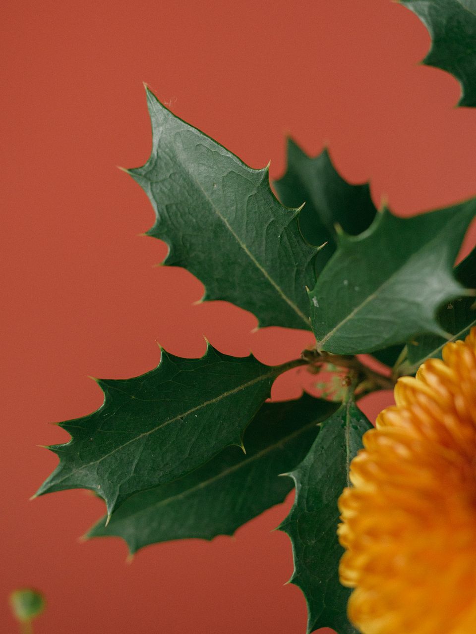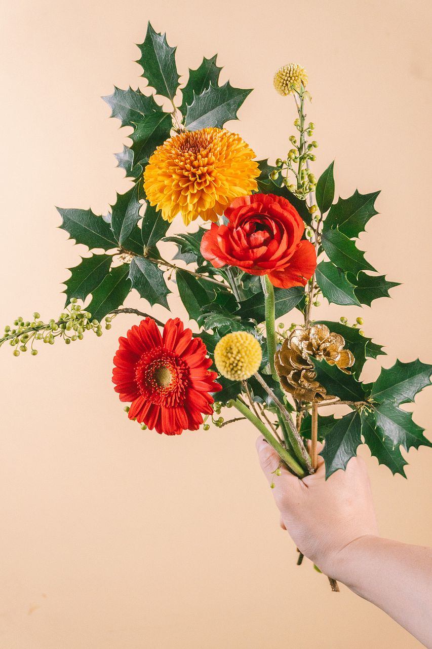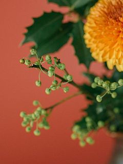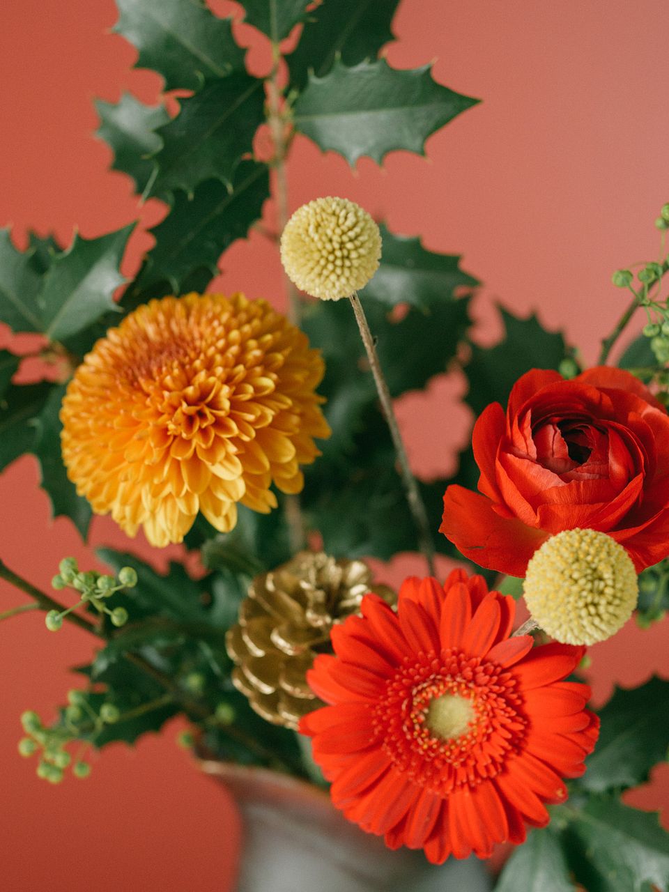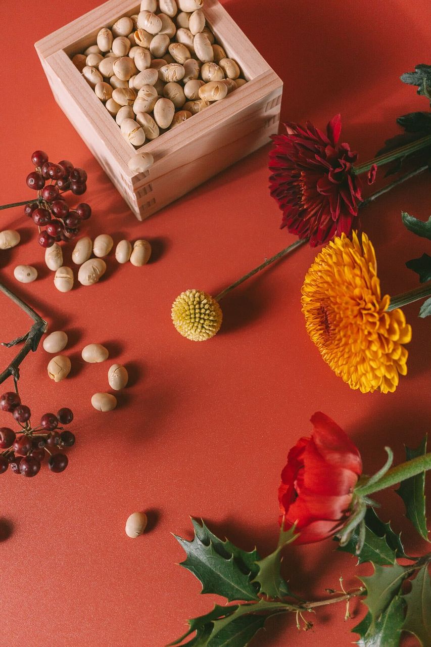 赤鬼をイメージした赤と黄色の花を中心に、魔除けの意味を持つヒイラギの葉を合わせました。豆をイメージしたお花や枝物にも注目してみて👀