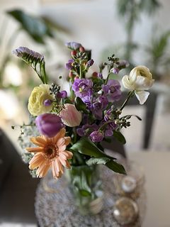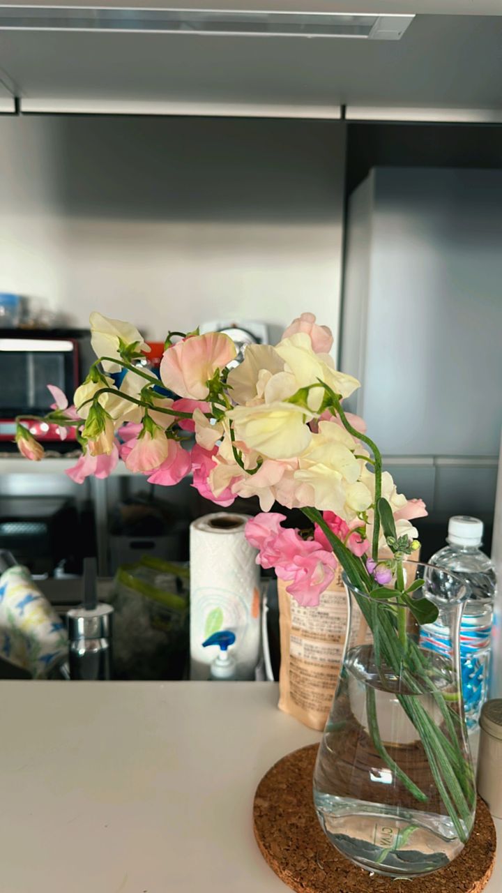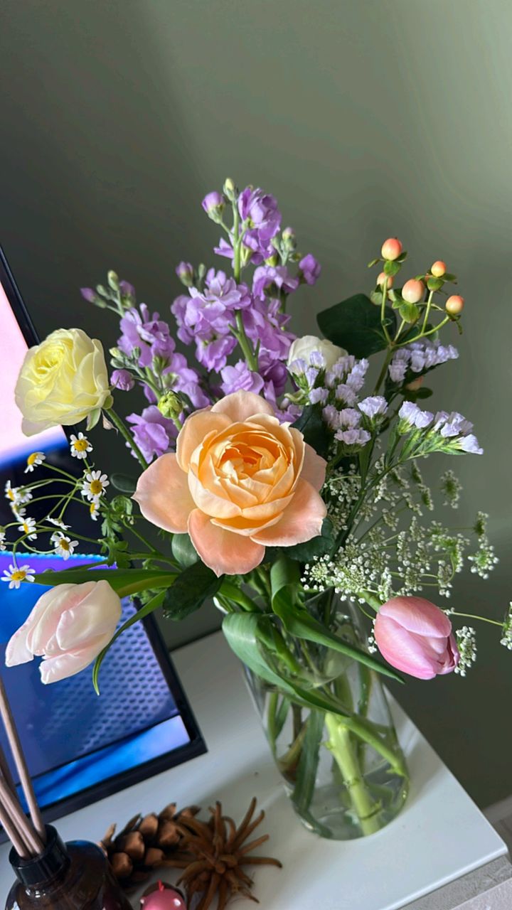 届いた箱を開けた途端お花の香りがふわっと広がり、そこには春らしい彩りのお花たちが現れました💐今回は2束をバラして飾りましたが、とっても華やかでいて清楚な感じのブーケで、今回も大満足のブーケでした!