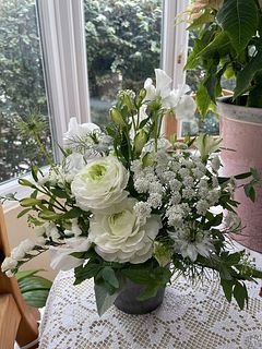 ホワイトカラーのラナンキュラスやスイートピーがまるで白鳥が優雅に舞っているよう🦢