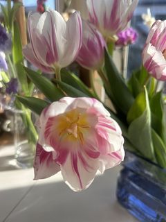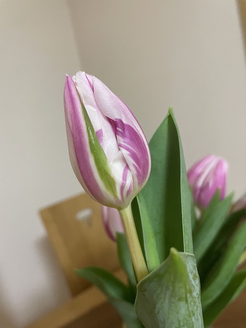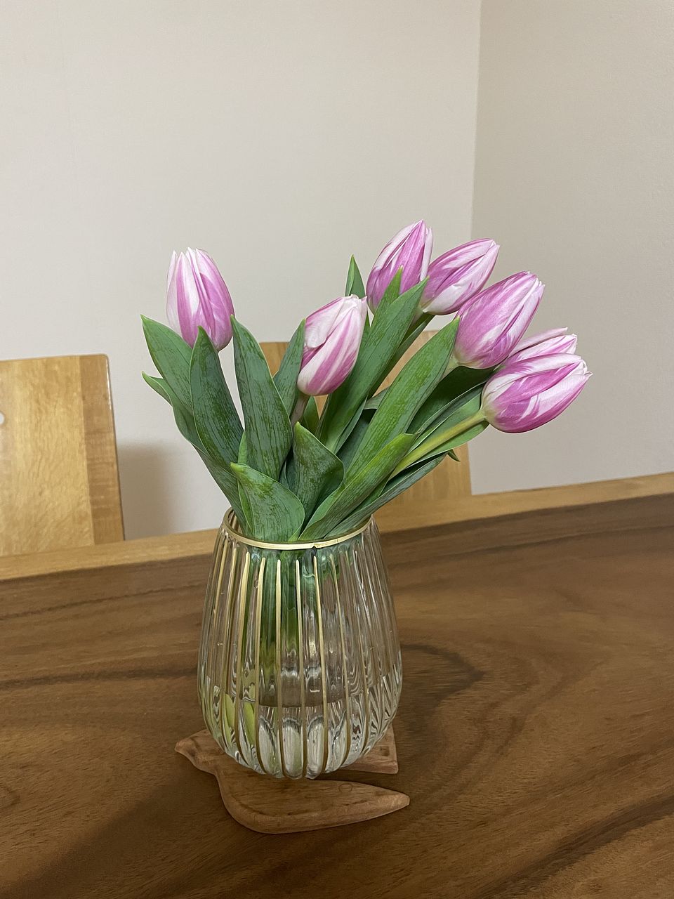 可愛いすぎた。今年はチューリップリレーをしてしまいそうです。この可愛さはおかわり級🙏💓💓 シャッキシャキの葉っぱで新鮮。 お花にまだ緑が残ってる感じがツボです。 少し短めがテーブルブーケに良い高さでした💓