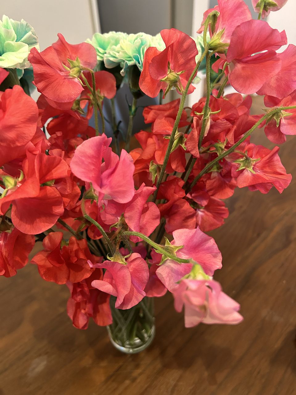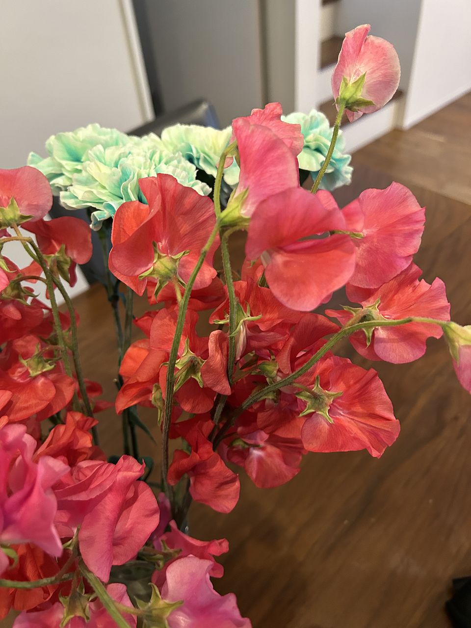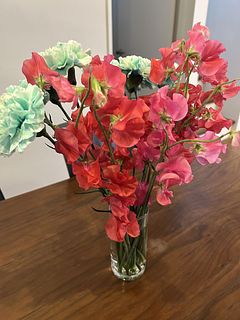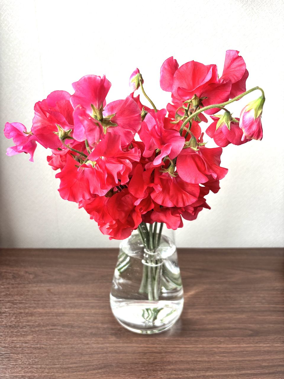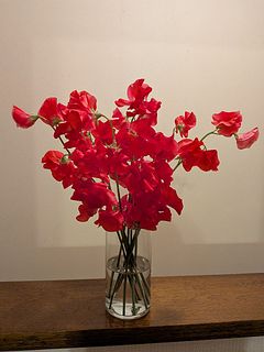 直前に連絡がありましたが、2本は濃いピンクのスイトピーでした。 赤いスイトピーからはほのかに甘い香りがして、香りと花の両方で癒されます。 日持ちもしてくれるようお手入れいたいと思います。