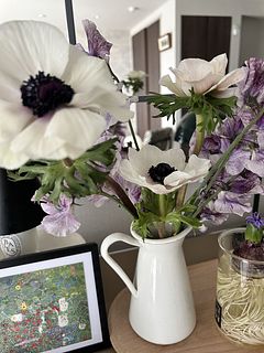 珍しいホワイトのアネモネ「ホワイトブラックセンター」と絞り染めのようなカラーリングが美しいスイートピー「詩かすみ」を贅沢に束ねて🦋