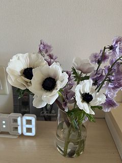 他のレビューの方と違いホワイトアネモネ2本とピンクのアネモネ2本の組み合わせでしたが、可愛くてホッとしました☺️到着して数時間ホワイトが開き、今朝ピンクが開き始めました! スイートピーも珍しい色合いで素敵です。