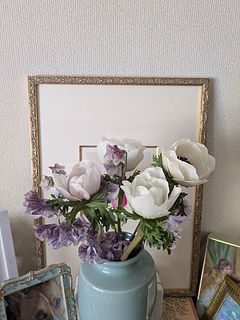 甘すぎないとても素敵な雰囲気! ガラスの花器が合いそう、と思って生けました。 淡く春の気配がして、気に入っています。 欲を言えば、アネモネを一輪減らしてユーカリが少し入っていたら完璧だと思います。