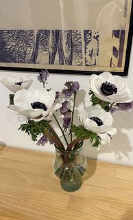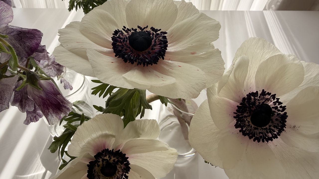 到着から1週間です。アネモネ1本が脱落しましたが、まだまだきれいです。白〜薄紫〜黒紫のグラデがきれいで気に入りました!