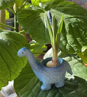 初めて球根を購入 ブラキオサウルスとても可愛いです♡ ムスカリも咲いてきました 1日でも長く咲いてくれるといいなぁ 育て方、、 水は根が浸かるだけの少量で良いのですね* どちらも記載されており混乱しましたが、検索し判断しました
