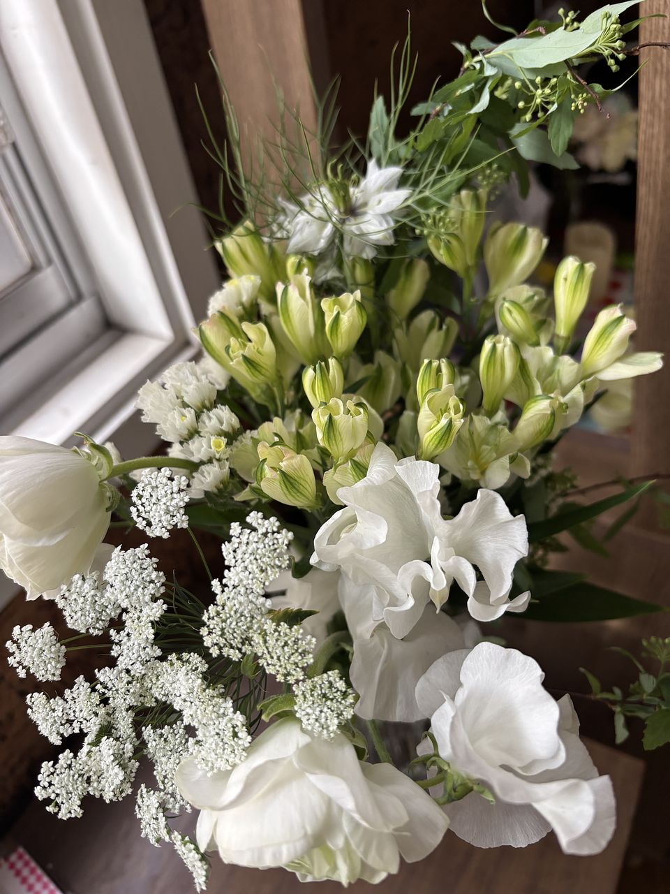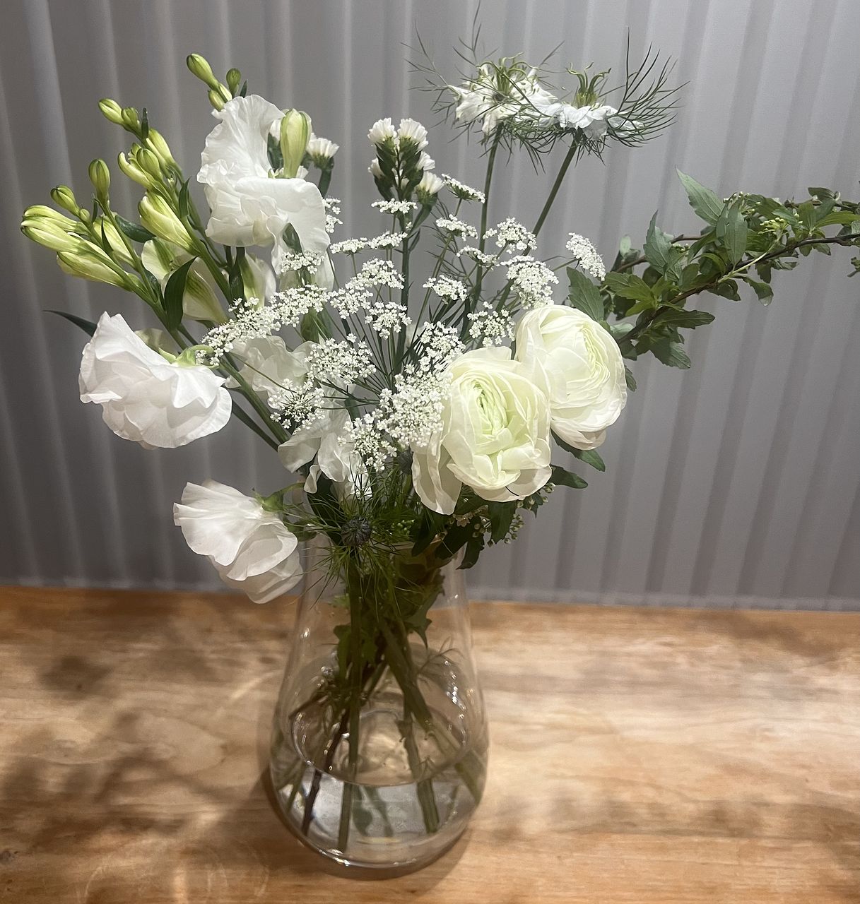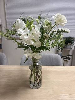 ホワイトとグリーンの組み合わせがとっても爽やかで美しいです。ニゲラなどなかなか田舎にないお花も入っていて満足しています。期待通りキッチンが爽やかで明るくなりました。360度花を見るような場合は少しボリュームに欠けるのですが、(それはお値段相当なので)壁の前などならとてもいいかと思います。2束のセットとかもあればいいなと思います。