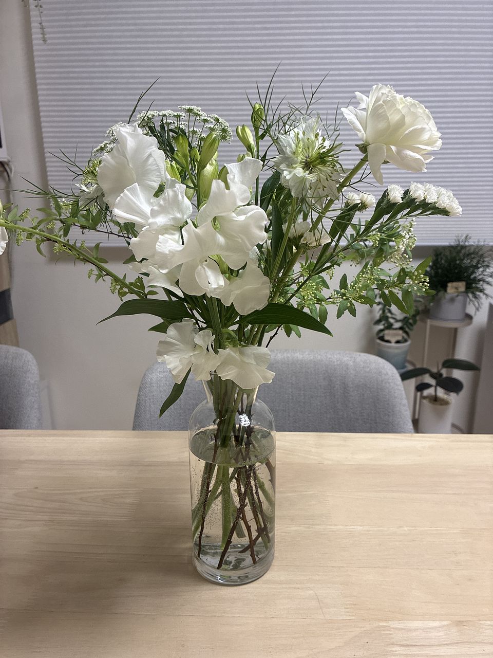 箱から出した時はボリュームが少ないと感じましたが、皆さんの生け方を参考にしてみたら、ボリュームも気にならなくなりました。 花のチョイスは好みです。コデマリが1本水切れの状態です。復活してくれるかなぁ。
