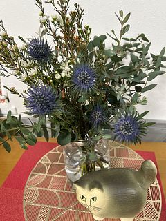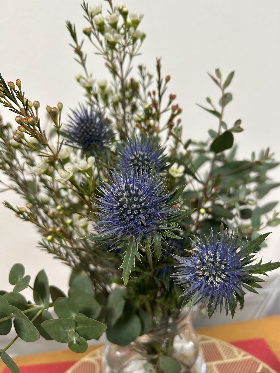 ワックスフラワーやエリンジウムを組み合わせて。ドライに向いてるお花をセレクトしています。ユーカリの香りも楽しんで! ワックスフラワーは葉っぱをこするととっても良い香り。