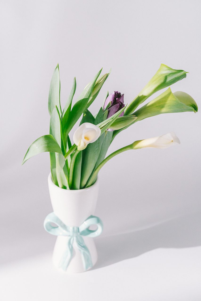 すっと伸びる葉と、カラーのなめらかな曲線、チューリップのやわらかな表情を束ねました🌷