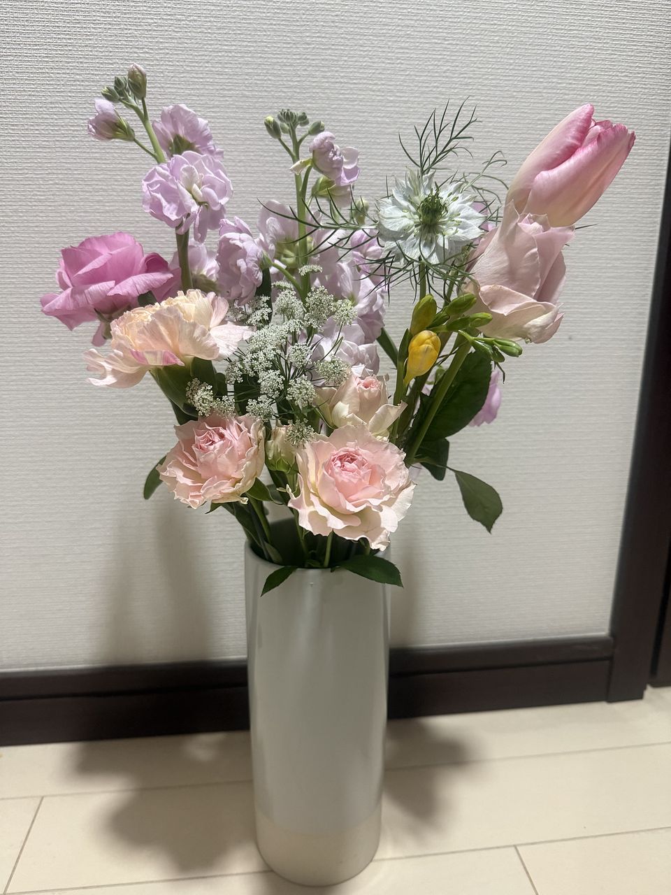 チューリップ、フリージア、ラナンキュラス、スイートピー、バラ、カーネーション、ストックなどをお届け☺️ほのかな甘い香りも一緒に楽しんで!