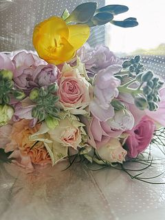 色合いが素敵で、ボリュームもあり大変気に入りました。優しく淡いピンクのお花が中心で、黄色いフリージアがいいアクセントになっています。