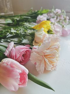 届いた時は、バラ1本とチューリップ1本がしなっとしていて、がっかりしてたのですが、水切りし、たっぷりの水で水揚げしたところ、元気を取り戻しました。淡いピンクの優しい花束、バラのいい香りがします。暖かいリビングに飾っていたら、花びらがあっという間に開いてしまったので、涼しい場所に移動してほっこりしています。