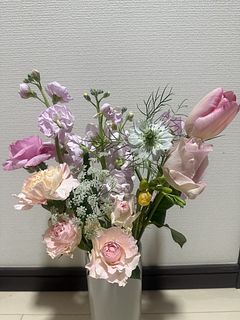 ピンク色のブーケを飾りたくて購入しました🌸 可愛いバラやチューリップ、ストックやスイートピーが届き、家族も喜んでくれました☺️🌷