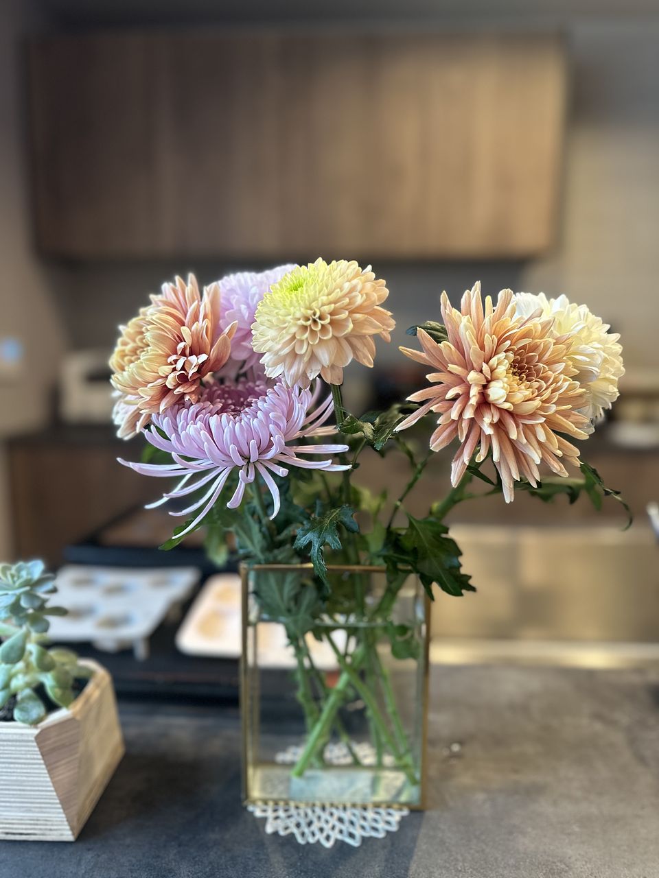お花の状態は良かったです。 色合いが濃いピンクがなく薄い色が多く、若干仏花のように感じてそこは残念に思いましたが、葉を落として飾ると綺麗でした。 一緒に購入した花瓶も気に入りました。