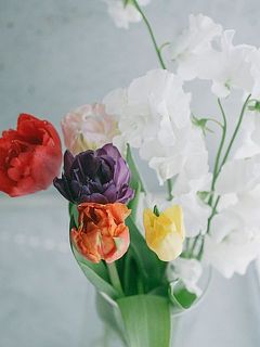 チューリップたちと雪のように真っ白なスイートピーとの組み合わせが魅力のブーケです。