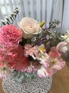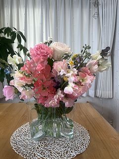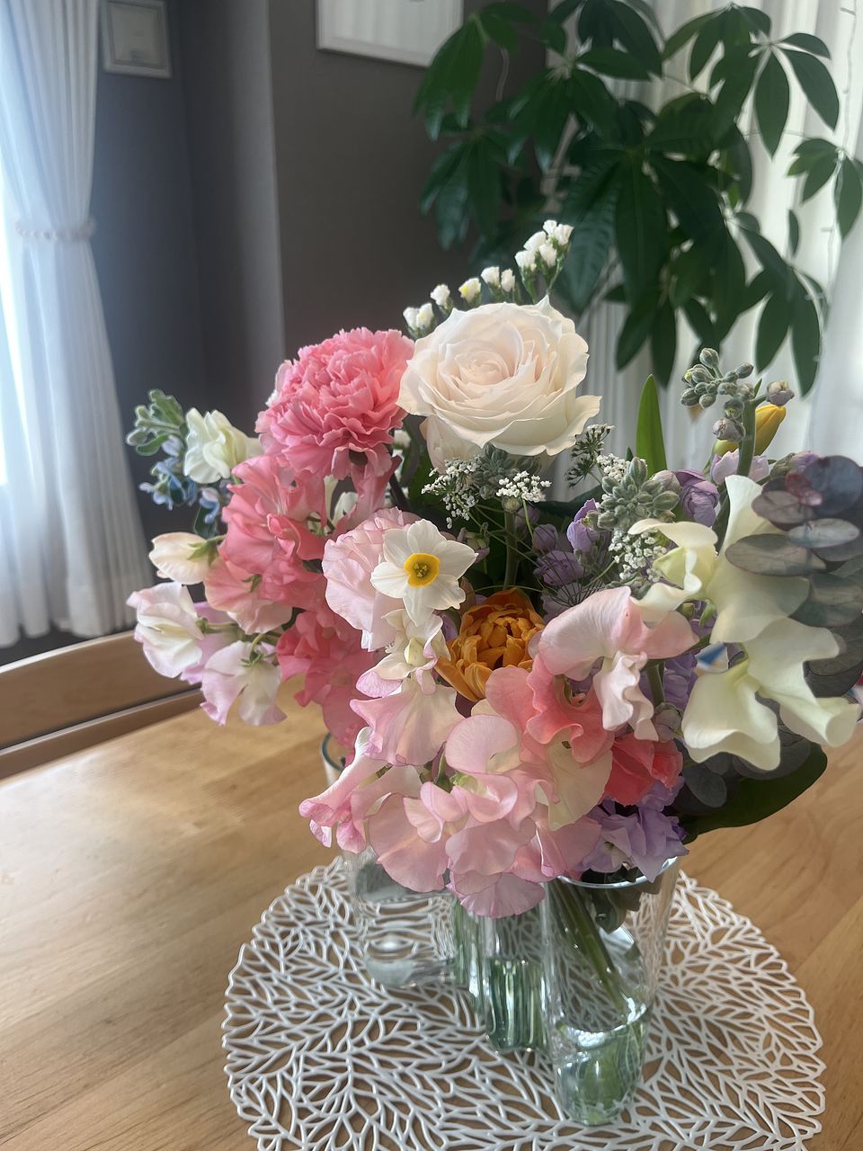 届いた箱を開けた途端お花の香りがふわっと広がり、そこには春らしい彩りのお花たちが現れました💐今回は2束をバラして飾りましたが、とっても華やかでいて清楚な感じのブーケで、今回も大満足のブーケでした!