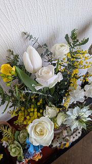 箱を開けた瞬間、ふわっと広がる香りに思わず笑顔になりました。ミモザの明るい黄色と白いお花の組み合わせがとても可愛らしく、お部屋が一気に春の空気に包まれます。飾るだけで生活に潤いが生まれ、何度も眺めてしまうほど素敵なブーケでした。お花の状態もとても良く、大満足です。またぜひお願いしたいと思います。