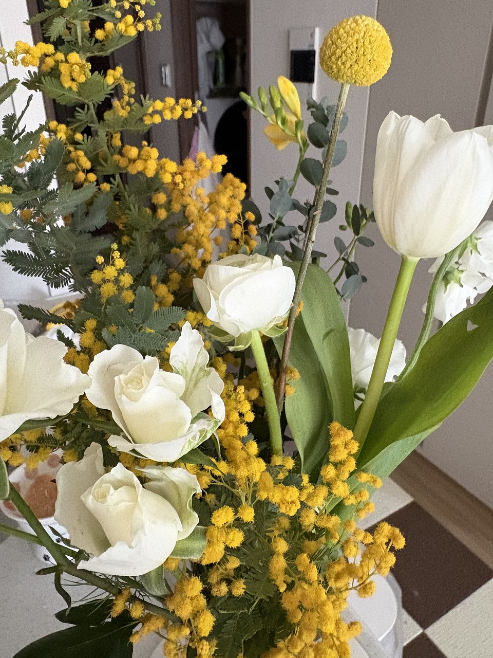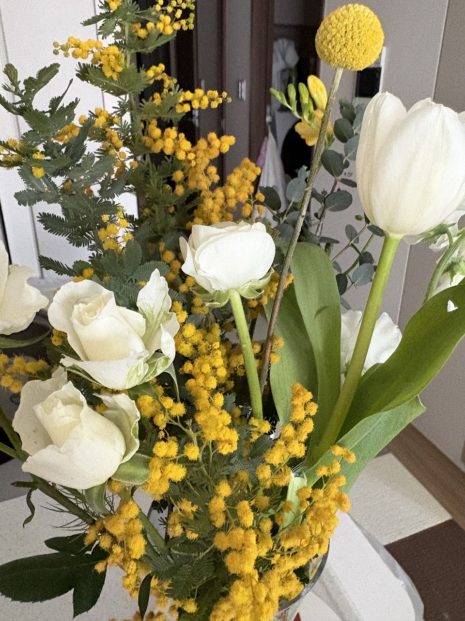 大好きなミモザが一足先に届きました 白いバラもステキです ドライにするつもりです
