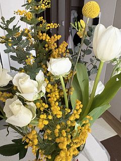 大好きなミモザも入って可愛いく飾れました。 ただ、ミモザの1本が茶色に変色していました。 いずれドライフラワーにする予定ですが もう少し黄色いミモザを楽しみたかったな…。