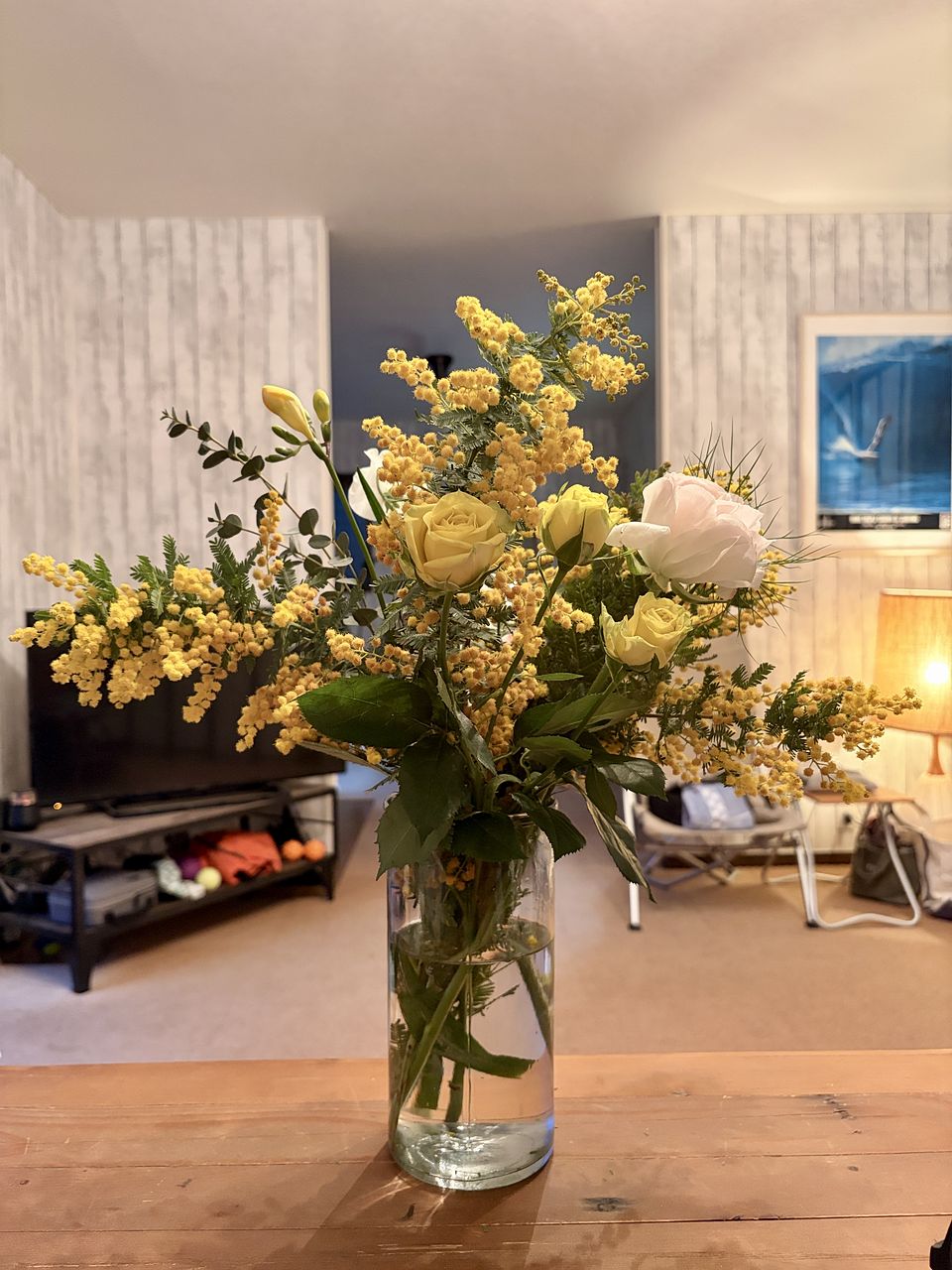 一気にお部屋が華やぎました☺️ 合う花瓶が無くて1本ミモザが分かれちゃったけど。新しい花瓶が欲しくなりました☘️