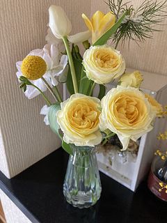 素敵なブーケでした。ミモザ、我が家の方は北国でミモザは育たないので、このふわふわの明るい黄色のお花は、お花屋さんで会える季節限定のお楽しみ!ユーカリもたっぷりで、ワクワクしながらいけました。柔らかい茎のラナンキュラストスイートピー、折れていて、そこだけが残念😢 でも、とっても素敵な春色ブーケ、ありがとうございます😊