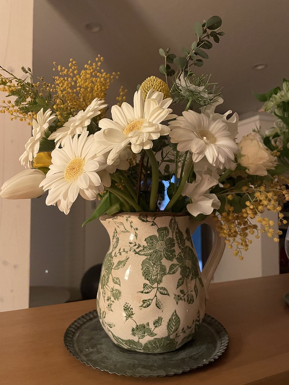 ボリュームもたっぷりの花束で、ミモザのフアフアと白い花の組み合わせが、とても爽やかで、部屋を明るくしてくれました💕ミモザも量が多いので、2つに分けて飾っています✨
