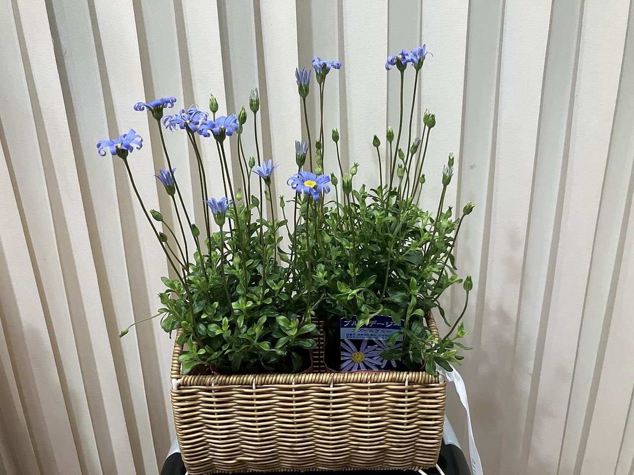 ブルーデージー「アズールブルー」を2鉢とバスケットをお届けします。澄んだ青い花びらと、黄色い中心のコントラストがきれいな品種です。株元から次々に花が上がり、春〜初夏まで長く楽しめます🌼🩵鉢植えはもちろん、寄せ植えのアクセントにもおすすめです。
