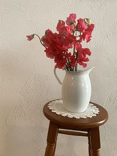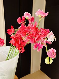 直前に連絡がありましたが、2本は濃いピンクのスイトピーでした。 赤いスイトピーからはほのかに甘い香りがして、香りと花の両方で癒されます。 日持ちもしてくれるようお手入れいたいと思います。