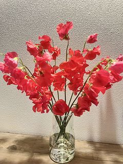 届く前に「個体差により濃いピンク色が混ざる場合があります」とお詫びのメールが届いたので、「赤は難しいのかぁ、、」と思っていましたが、届いたスイートピーはイメージ通りの赤でした! 赤いスイートピーは憧れていたのに、実物を見たことがなかったので感激です。よーーく見ると「この子が濃いピンクかな?」と思うお花もありましたが、言われなければ分からなかったと思います。 とても可愛くて、心の岸辺に咲いてくれました!笑