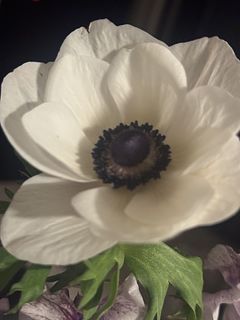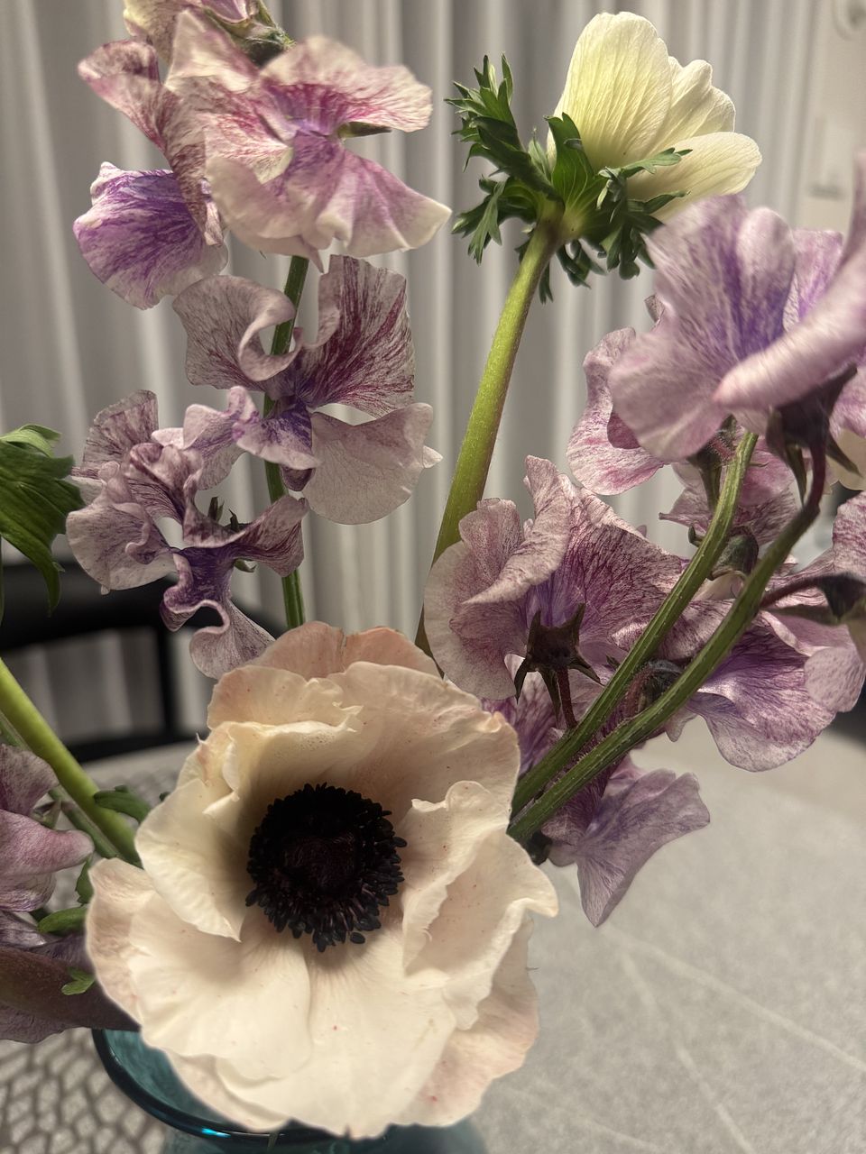 珍しいホワイトのアネモネ「ホワイトブラックセンター」と絞り染めのようなカラーリングが美しいスイートピー「詩かすみ」を贅沢に束ねて🦋
