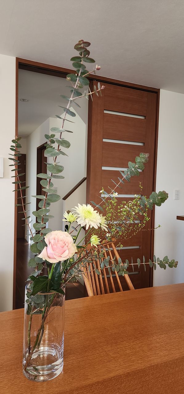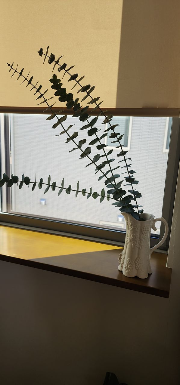 枝に個性があるので仕方がないのですが、太くて立派な枝が2本。形が可愛くなくて、どっしり感満載でした! 枝をカットして小さめの花瓶に。 太い枝は短めに剪定して何とかおさまりました。 ユーカリは確か抗菌作用があったような気が、、。 インフルエンザが流行っているので、ユーカリで家族の健康を維持したいと思います!