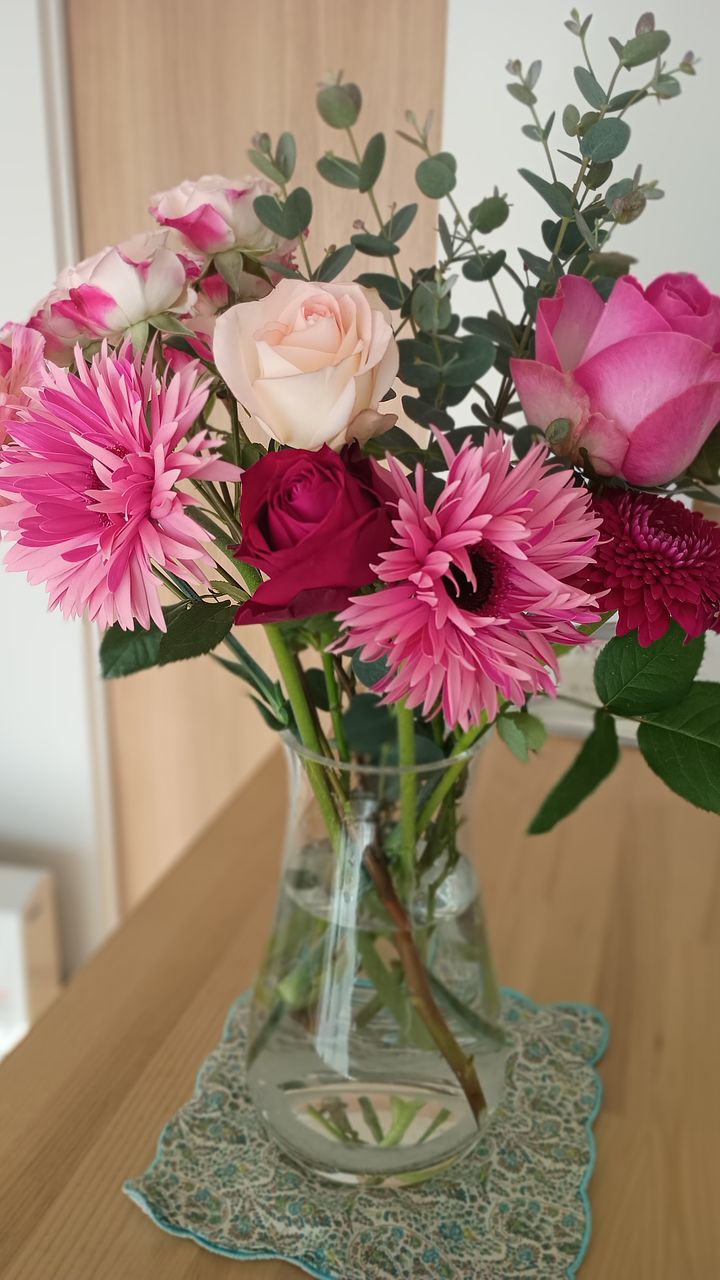 可愛いピンクの花がたくさん届きました。すぐに水揚げして…玄関とリビングに飾りました。 雰囲気が和らいでとてもいい感じです。 花を見るたびにテンションあがって、笑顔になれます