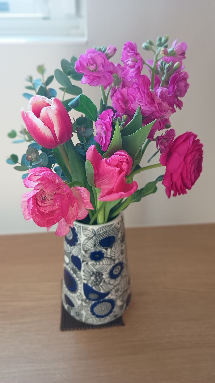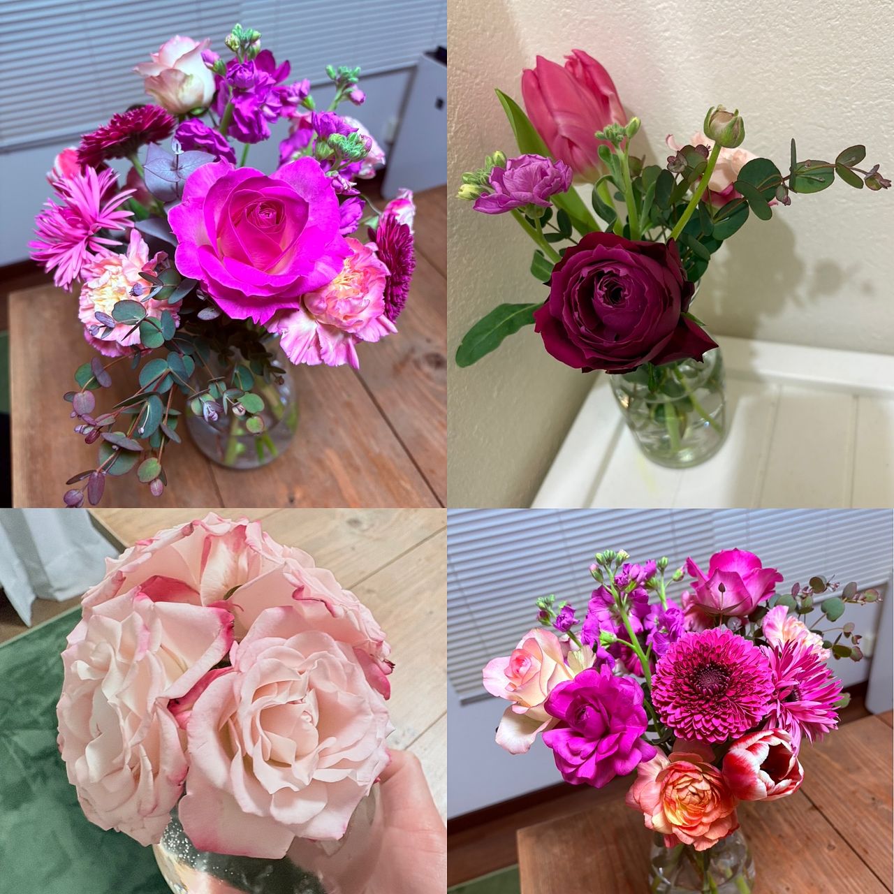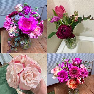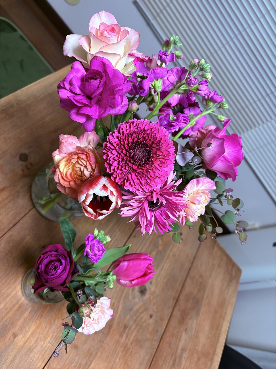 ピンクのグラデーションで可愛いいお花ばかり。グリーンもおしゃれで良かった!花瓶4つ分できてお得感あり。 この時期のチューリップとスイトピーが特に可愛いかったです。スプレーカーネーションがちょっとキツイ感じで雰囲気が違う感じでした。
