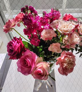 2束をまとめて飾りました。 様々な種類のお花が入っていてとても楽しいです。 お花もたいそうみずみずしくて新鮮です。 心がワクワク嬉しくなってしまうブーケです。 リピートしたいと存じます。 ありがとうございました。