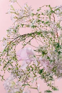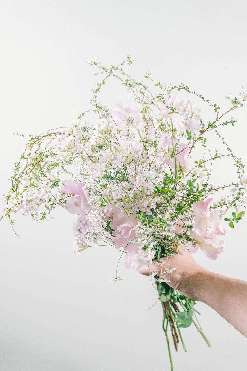 まるで桜吹雪🌬️🌸動きのある雪柳と淡いピンク色のスイートピーをかわいく合わせました。雪柳は蕾の状態から少しづつ白い小さな花を咲かせます🤍