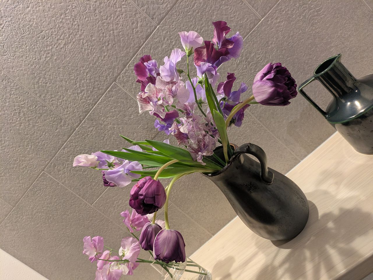 淡い紫を中心に丸みのあるチューリップとふんわり軽やかなスイートピー。