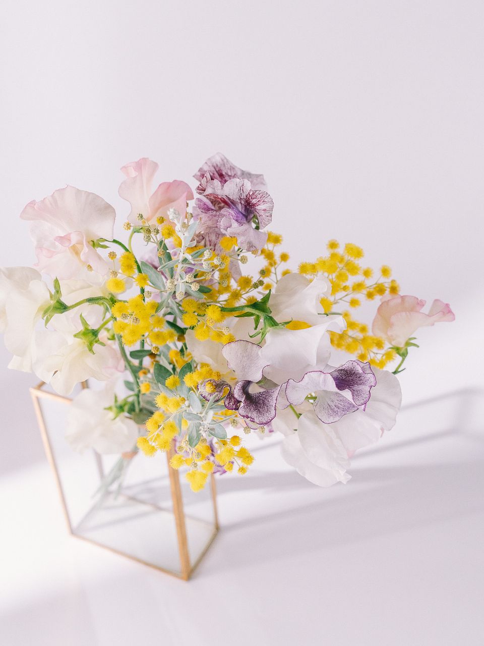 カラフルなスイートピーとミモザを束ねて🐝