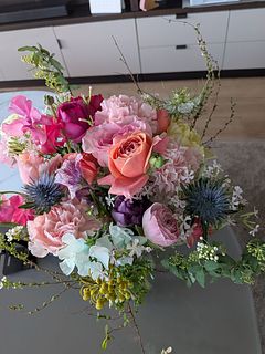 スパイラルに組まれていて葉の処理もしてあるのでそのまま飾って楽しめます。たっぷり入っているので華やかです。内容は毎回おまかせですが、色の雰囲気は同じ雰囲気でお届け予定です。お楽しみに!